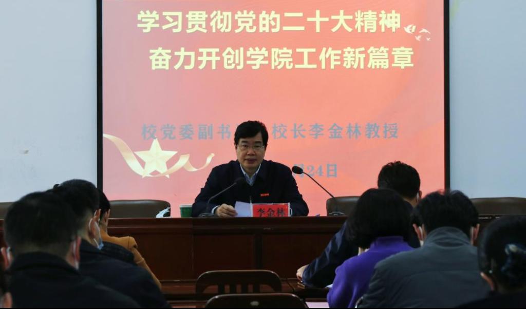 李金林以《學(xué)習(xí)貫徹黨的二十大精神,奮力開創(chuàng)學(xué)院工作新篇章》為題,圍繞“怎么學(xué)、怎么看、怎么辦”,深入講解和系統(tǒng)闡述了黨的二十大主題和主要成果、過去5年的工作和新時代10年的偉大變革、馬克思主義中國化時代化、中國式現(xiàn)代化、全面建設(shè)社會主義現(xiàn)代化國家的目標(biāo)任務(wù)、堅(jiān)持黨的全面領(lǐng)導(dǎo)和全面從嚴(yán)治黨、應(yīng)對風(fēng)險(xiǎn)挑戰(zhàn)等7個方面的重大理論和實(shí)踐問題,分享了學(xué)習(xí)黨的二十大精神的心得體會,就如何貫徹落實(shí)黨的二十大精神對學(xué)院工作提出了明確要求。