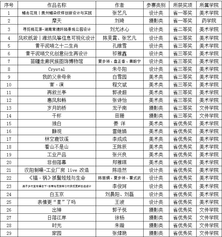 在此次大展中,我校美術(shù)學(xué)院2021級(jí)碩士研究生張藝凡創(chuàng)作的設(shè)計(jì)作品《蠟去花現(xiàn)》獲學(xué)生組設(shè)計(jì)類一等獎(jiǎng)。藥學(xué)院2019級(jí)本科生劉琦創(chuàng)作的攝影作品《摩天》獲學(xué)生組攝影類一等獎(jiǎng)。美術(shù)學(xué)院2022級(jí)碩士研究生劉尤冰心創(chuàng)作的設(shè)計(jì)作品《尋覓桃花源—湖南常德阡陌景觀公園設(shè)計(jì)》獲學(xué)生組設(shè)計(jì)類二等獎(jiǎng)。美術(shù)學(xué)院陳旻霄等6名同學(xué)的作品獲設(shè)計(jì)類三等獎(jiǎng)5項(xiàng),美術(shù)學(xué)院白雪園等4名同學(xué)的作品獲美術(shù)類三等獎(jiǎng)4項(xiàng),文傳學(xué)院龍子南等2名同學(xué)的作品獲得攝影類三等獎(jiǎng)2項(xiàng)。