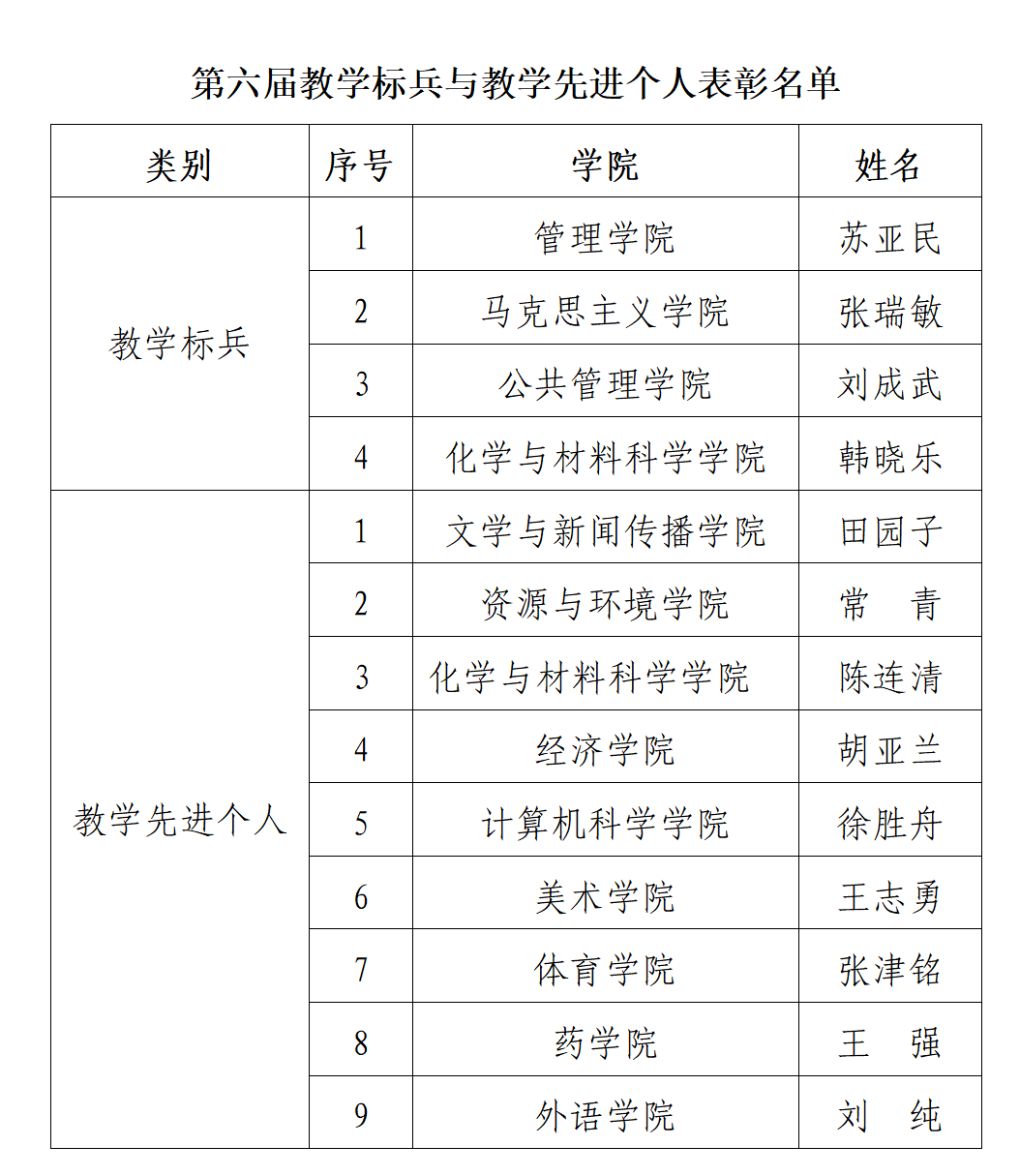7月13日,學(xué)校第六屆教學(xué)標(biāo)兵與教學(xué)先進(jìn)個(gè)人評(píng)選工作圓滿結(jié)束。本屆評(píng)選工作于2023年3月啟動(dòng),學(xué)校高度重視,教務(wù)處精心組織,各學(xué)院認(rèn)真推薦,各相關(guān)單位積極支持。經(jīng)過(guò)學(xué)院推薦、材料審核、課堂教學(xué)考查、會(huì)議評(píng)審、結(jié)果公示、校長(zhǎng)辦公會(huì)議和黨委常委會(huì)審定等環(huán)節(jié),前后歷時(shí)3個(gè)多月,評(píng)選出教學(xué)標(biāo)兵4名、教學(xué)先進(jìn)個(gè)人9名。