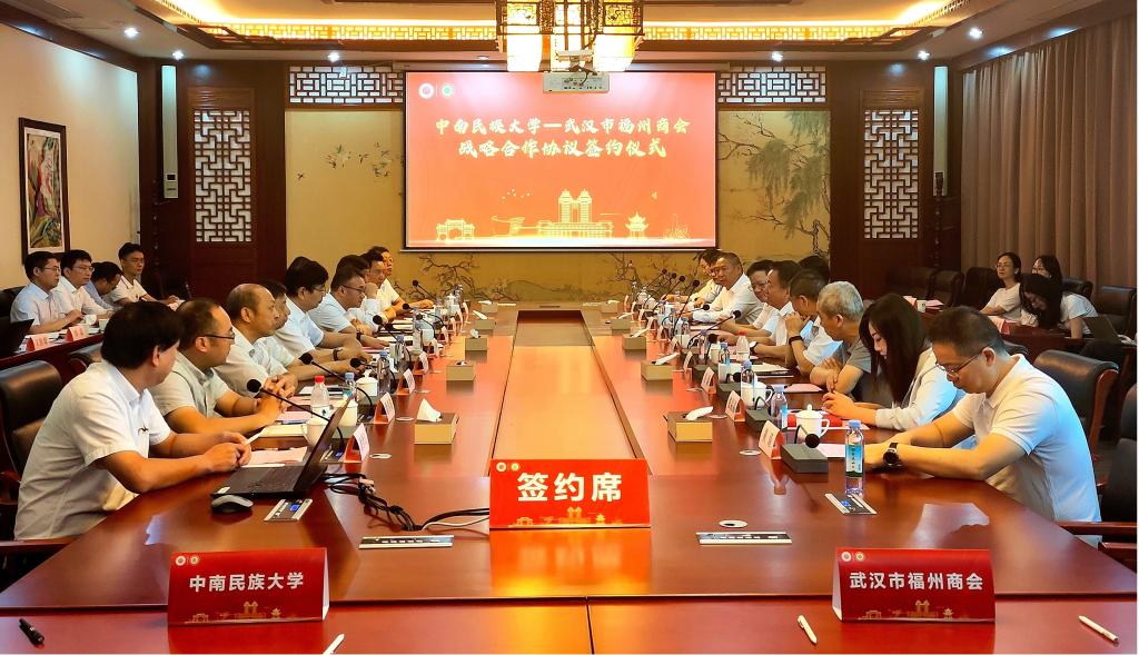 為深入貫徹落實國家民委事業單位改革發展部署會精神,全面推進產教融合、科教融匯,9月1日,學校與武漢市福州商會簽署戰略合作協議,推動形成“以共建促黨建、以黨建促合作、以合作促發展”的校商企工作新格局。武漢市工商聯副主席楊松民,武漢市福州商會會長陳強、執行會長陳增炎及商會會員企業代表,我校校長李金林、副校長杜冬云及學校黨政辦、創新創業學院、教務處、招就處、團委和相關學院負責同志出席簽約儀式。簽約儀式在我校國際學術會議中心舉行,杜冬云主持。