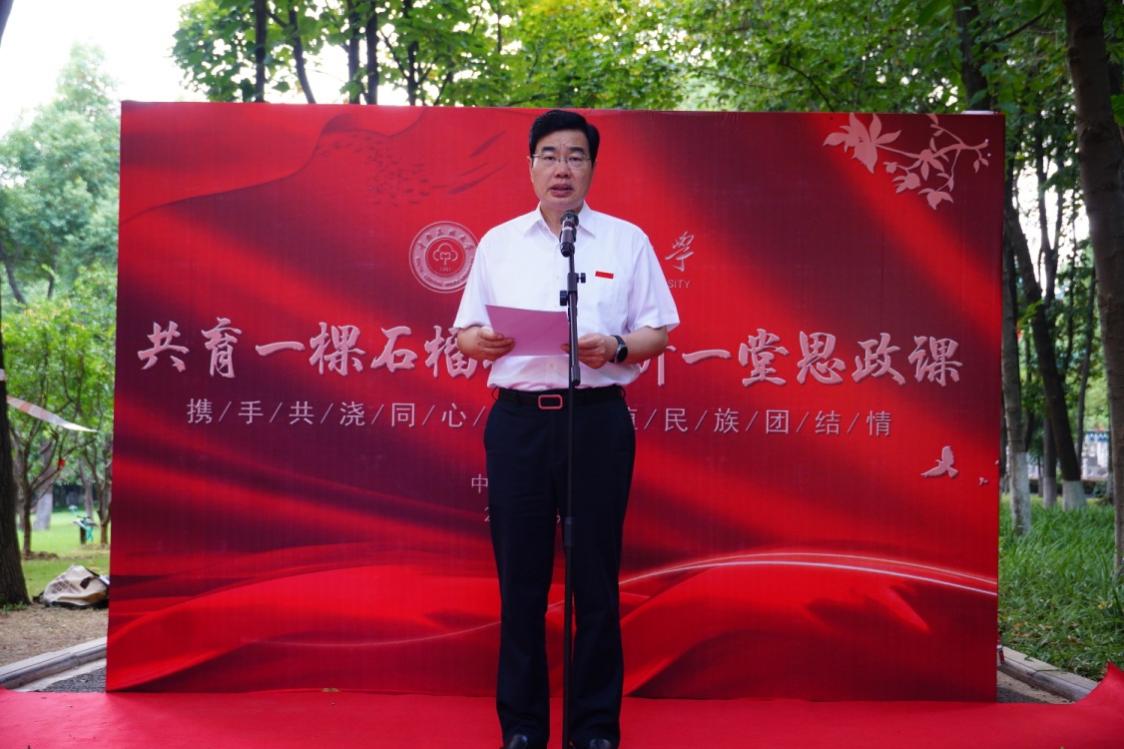 為全面把握習近平總書記關于加強和改進民族工作的重要思想,將鑄牢中華民族共同體意識教育融入思政課教學內容,不斷夯實當代大學生鑄牢中華民族共同體意識思想基礎,將“四個與共”“五個認同”意識植根在各族大學生心靈深處,9月8日下午,來自五湖四海的民大學子們齊聚南湖園石榴園,共育一棵石榴樹,共聽一堂思政課。校長李金林,校黨委副書記、副校長宋發軍,黨委學生工作部、宣傳部、各學院師生代表參加。活動由宋發軍主持。
