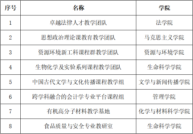 我校卓越法律人才教學團隊、思想政治理論課教育教學團隊、資源環境新工科課程群教學團隊、生物化學及實驗系列課程教學團隊入選省級教學團隊,中國古代文學與文化傳播課程教學組、跨學科融合的會計學專業平臺課程組、有機高分子材料教學基地和食品質量與安全專業教研室入選優秀基層教學組織。