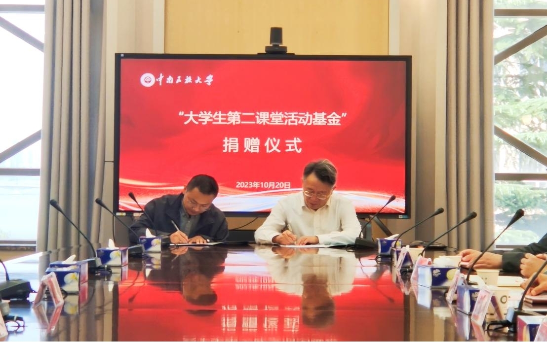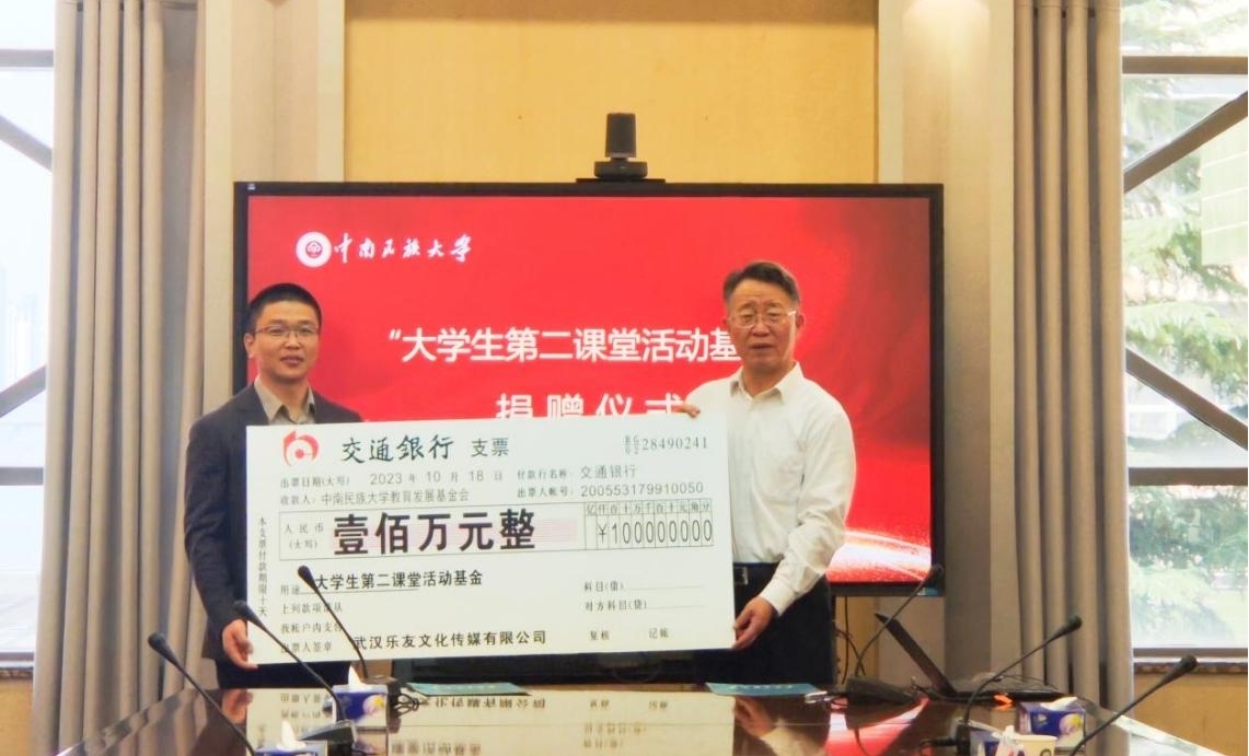 捐贈儀式上,武漢樂友文化傳媒有限公司向學校“大學生第二課堂活動基金”項目捐贈100萬元。白江源代表校教育發展基金會與李瑞飛和胡琪簽訂捐贈協議。
