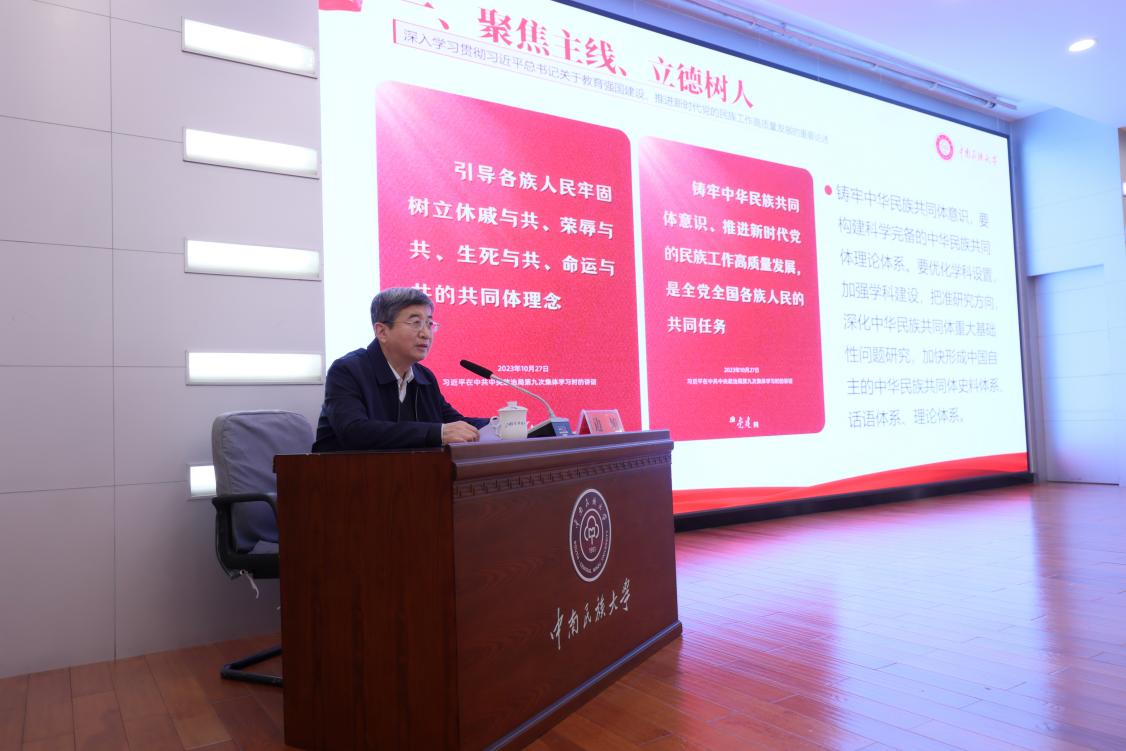 邊境以《傳承立德樹人初心使命,堅決扛牢培根鑄魂育時代新人政治責任》為題講授思政課。他表示,學校要深入學習貫徹習近平總書記關于教育強國建設、推進新時代黨的民族工作高質量發展的重要論述,將其轉化為推動高等教育高質量發展的生動實踐,為鑄牢中華民族共同體意識提供有力的人才支持和智力支撐。要深刻把握學校思想政治教育工作面臨的形勢任務,分析形勢變化,找好視角、找準技巧、找好切口,主動解決學生成長過程中的思想困惑、心理困擾和現實困難。要守正創新推動時代新人鑄魂工程落地生根,廣大輔導員要錘煉黨性,著力提升自己的政治素質、理論水平、職業能力和專業素養,不斷改進工作方法,優化工作協同,拓展彼此成就的深度,積淀職業能力的厚度。要落實立德樹人根本任務,為教育強國建設凝心聚力,為實現中華民族偉大復興提供更多有力支撐。