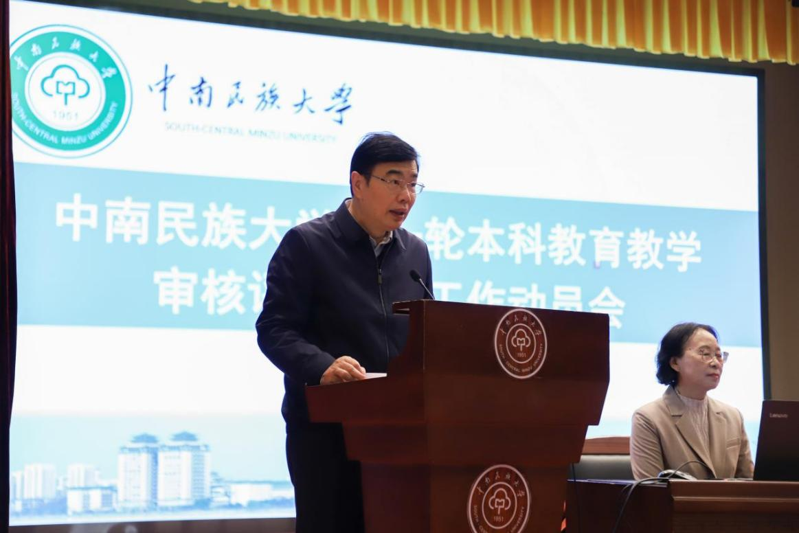 校黨委副書記、副校長宋發軍介紹了我校本科教學評估工作實施方案。他說道,學校要圍繞“教育強國、高校何為”這一時代命題,以新一輪審核評估為契機,凝聚全校上下思想共識,認真落實立德樹人根本任務,從“三個‘強化’”“對標對表”“牢記使命”“質量文化”“改革創新”等方面下功夫,并列舉了學校當前還存在的一些教學問題,對教風學風建設等方面提出了進一步要求。