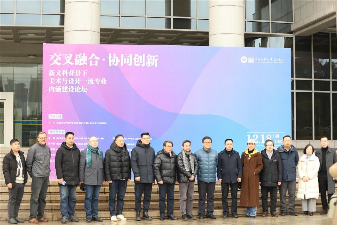 12月18日,由我校美術(shù)學院主辦的“交叉融合,協(xié)同創(chuàng)新——新文科背景下美術(shù)與設(shè)計一流專業(yè)內(nèi)涵建設(shè)”論壇在學術(shù)交流中心舉行。湖北美術(shù)學院副校長張煉,我校黨委常委、副校長覃瑞,湖北省內(nèi)外十余所高校的專家學者出席論壇,共商美術(shù)與設(shè)計一流專業(yè)建設(shè)新方向。論壇由美術(shù)學院院長吳海廣主持。