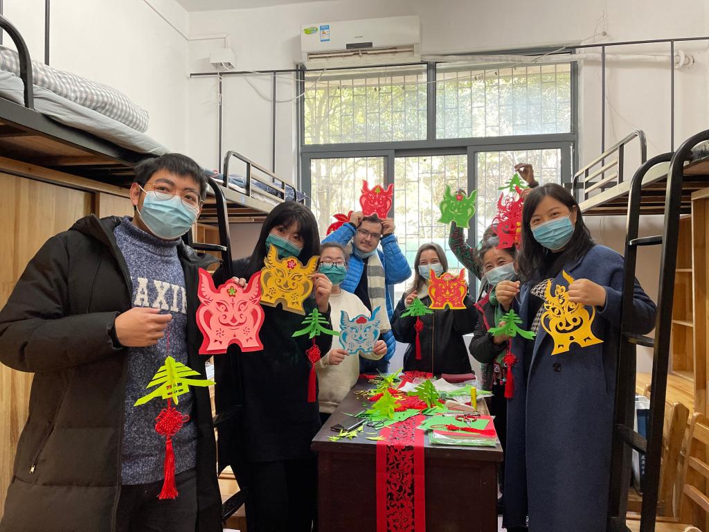 在學(xué)生宿舍3棟,3名留校學(xué)生和來自烏克蘭、哈薩克斯坦、科特迪瓦的3名留學(xué)生,我校退休教授何紅一、輔導(dǎo)員朱晶晶老師歡聚一堂,剪紙喜迎牛年。校領(lǐng)導(dǎo)與留校學(xué)生和留學(xué)生熱烈交談,參與了豐富多彩的剪紙活動,并叮囑學(xué)生們在歡度春節(jié)的同時,做好個人疫情防護工作。