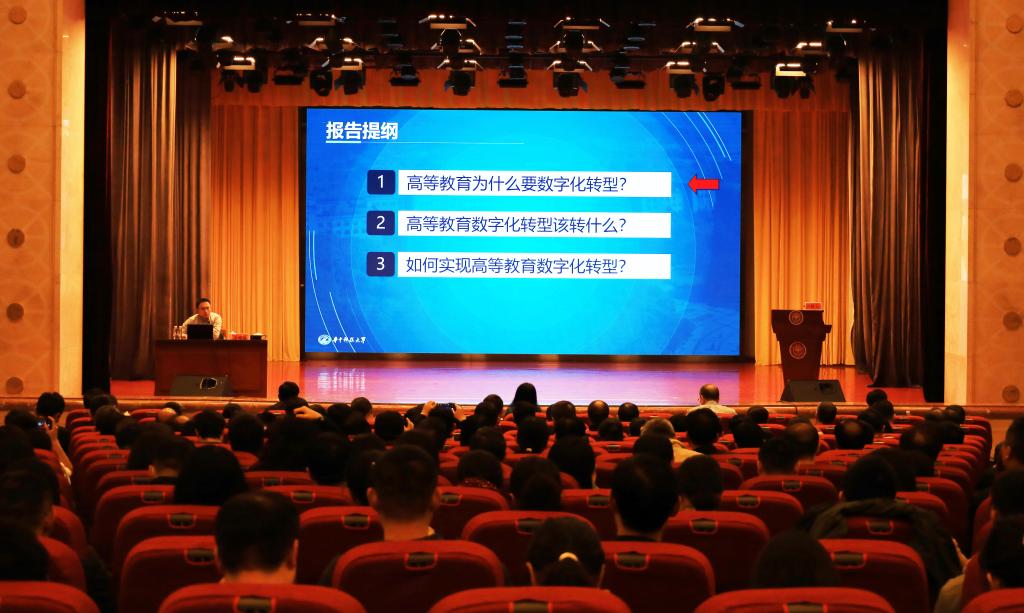 會議邀請了華中科技大學黨委常委、副校長于俊清作專題輔導報告。他以《高等教育數字化轉型戰略思考》為題,立足習近平總書記關于教育的重要論述和關于數字中國建設的重要指示批示精神,從高等教育為什么要數字化轉型、高等教育轉型該轉什么、如何實現高等教育數字化轉型3個方面,深刻闡述了高等教育數字化轉型面臨的機遇與挑戰,深刻剖析了轉型過程中存在的問題,提出了高等教育數字化轉型的“雙減/簡”之路。