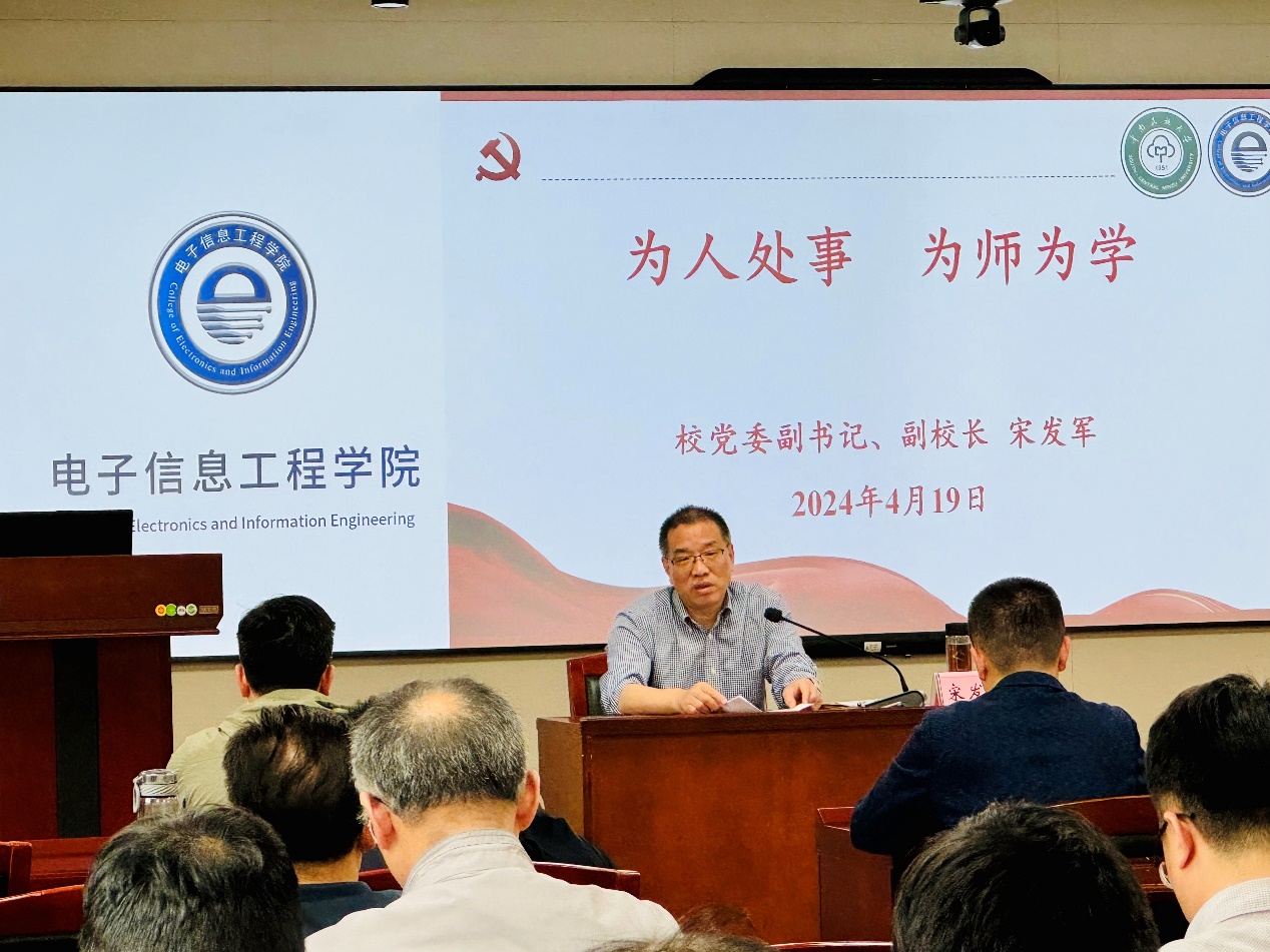 4月19日上午,校黨委副書記、副校長宋發軍到電子信息工程學院講授“為人處事 為師為學”主題黨課,并督導學院一體推進黨風、教風、學風建設。電信學院全體教工、學生黨員代表參加了本次學習。