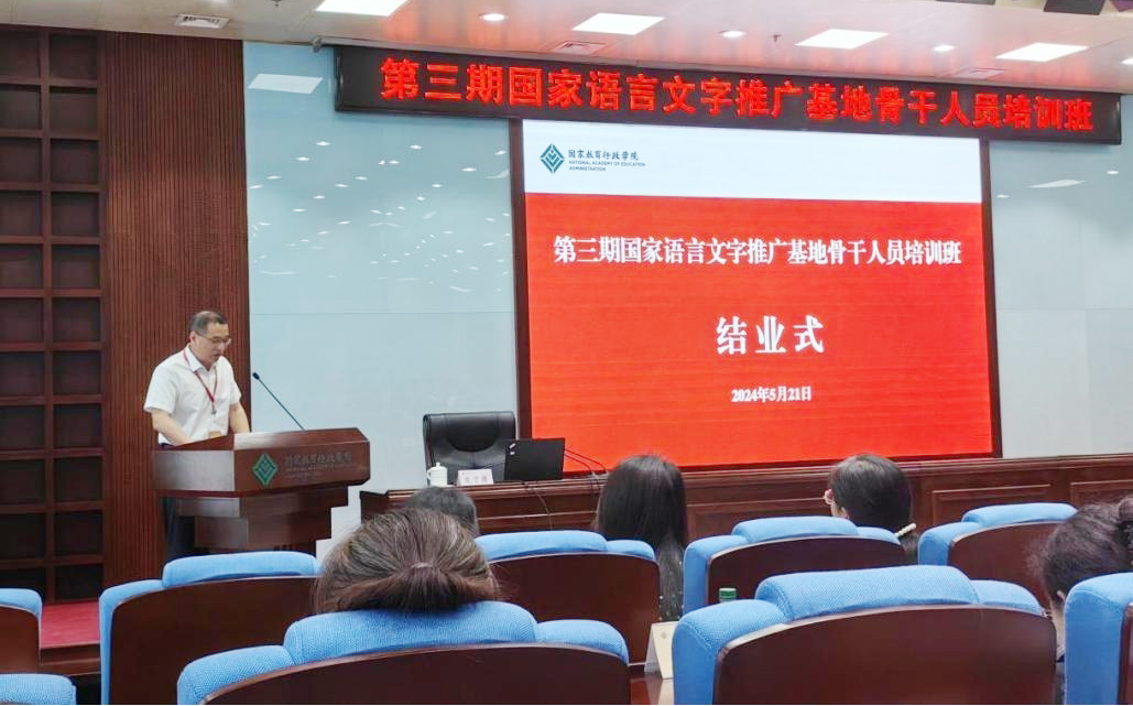 5月17日至21日,由教育部語言文字應(yīng)用管理司主辦的第三期國家語言文字推廣基地骨干人員培訓(xùn)在國家教育行政學(xué)院舉行。我校黨委副書記、副校長、推廣基地主任宋發(fā)軍,教務(wù)處處長、推廣基地副主任胡軍浩參加了培訓(xùn),宋發(fā)軍在培訓(xùn)班結(jié)業(yè)式上作專題發(fā)言。
