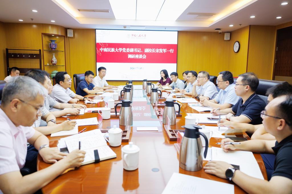 中國人民大學(xué)黨委常委、副校長馮仕政出席座談會(huì),教務(wù)處、研究生院、學(xué)科規(guī)劃與建設(shè)辦公室、科研處、人事處、國內(nèi)合作辦公室、公共管理學(xué)院、經(jīng)濟(jì)學(xué)院負(fù)責(zé)人參加座談交流。馮仕政熱烈歡迎我校前來交流,表示中國人民大學(xué)與中南民族大學(xué)兩校系出一源,學(xué)科專業(yè)相近,今后要進(jìn)一步加強(qiáng)交往交流,打造紅色育人共同體。宋發(fā)軍表示,中國人民大學(xué)是我國人文社會(huì)科學(xué)高等教育領(lǐng)域的一面旗幟,14個(gè)A類學(xué)科涵蓋了我校幾乎全部的人文社會(huì)科學(xué)學(xué)科專業(yè)。得到中國人民大學(xué)的支持和幫助,將極大提升中南民族大學(xué)人才培養(yǎng)的水平和質(zhì)量。參會(huì)人員就師生訪學(xué)、學(xué)術(shù)交流、博士后引育、學(xué)科專業(yè)建設(shè)等方面進(jìn)行了深入交流討論,明確了具體推進(jìn)合作的對接部門和聯(lián)絡(luò)方式。