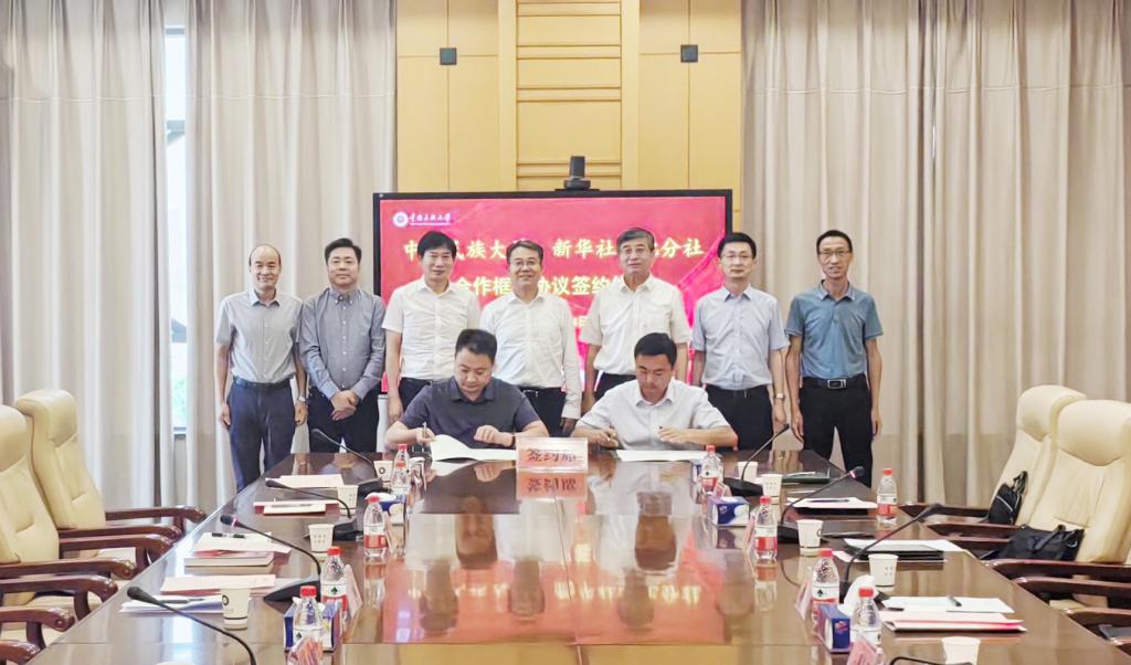 9月24日上午,我校與新華社湖北分社在學術交流中心簽署戰略合作框架協議。新華社湖北分社分黨組書記、社長惠小勇,分黨組成員、副社長汪鵬及有關部門負責人,我校黨委書記邊境,黨委副書記、副校長三朗扎西,校黨委常委、副校長方德斌及黨政辦公室(國內合作辦公室)、黨委宣傳部、科學研究發展院、研究生院、文學與新聞傳播學院、中華民族共同體學院(研究院)負責人出席儀式。儀式由方德斌主持。