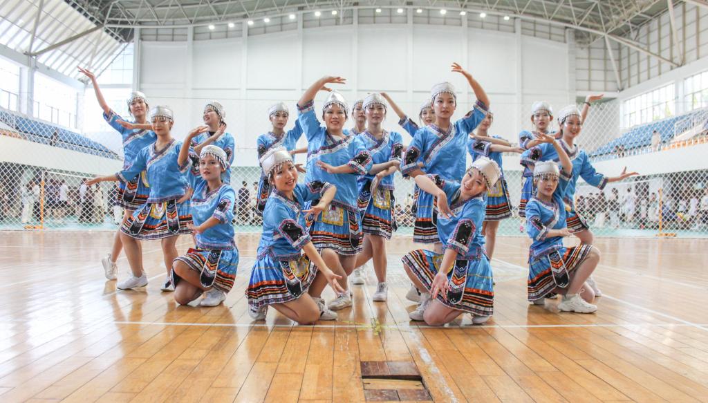 大學生藝術團的舞蹈《齊舞盛世》拉開了文體表演的序幕。他們身著民族服飾,隨音樂翩翩起舞,演繹民族團結一家親的盛世美景,舞姿優美,引得全場歡呼。跳繩隊展示了五人花樣跳繩。隊員們跟隨動感的節奏,隨跳繩上下翻飛,動作干凈利落,帶來一場技術與美感充分結合的視覺盛宴。緊接著是體育學院的健身操表演《鈴響華夏》,清脆的鈴聲伴隨著輕快的舞步,充分展現了民大學子的青春活力。龍獅隊的舞龍舞獅表演將現場氣氛推向高潮。隊員們動作矯健有力,配合默契,全場呼聲不斷。文藝表演在音樂舞蹈學院帶來的民族風舞蹈《大地春暉》中落下帷幕。