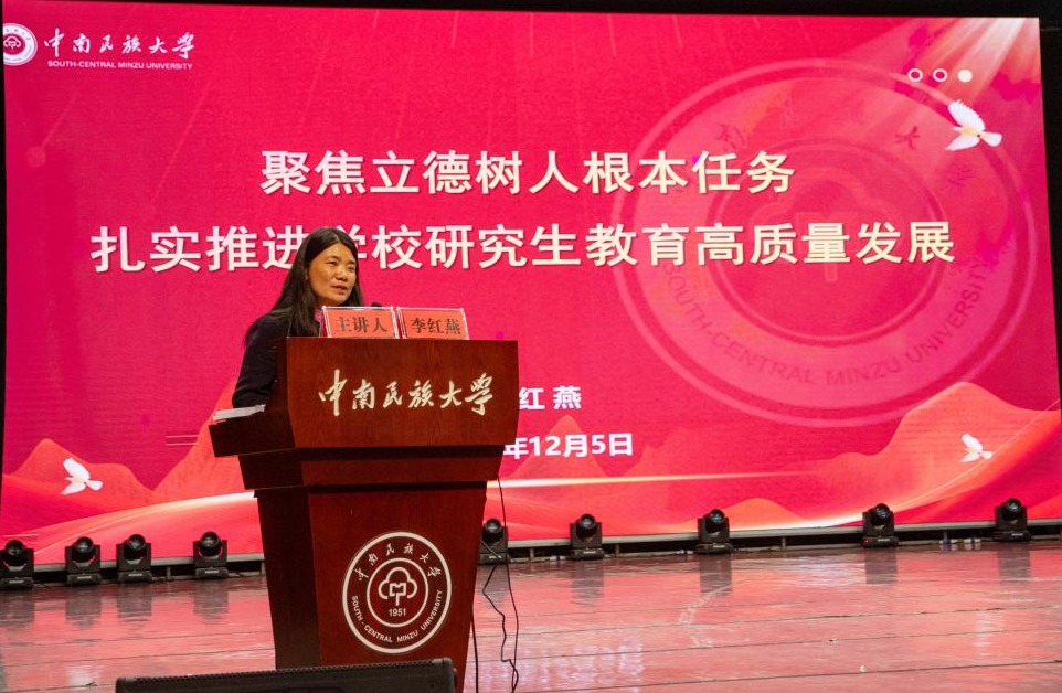 李紅燕作了題為《聚焦立德樹人根本任務,扎實推進學校研究生教育高質量發展》的報告。她從充分認識研究生導師的育人責任、持續做好研究生的意識形態教育、深入做好研究生的心理健康教育、協同做好研究生的校園安全管理等四個方面,通過豐富詳實、生動全面、緊扣時弊的案例材料,形象且深刻剖析了研究生指導工作的內容、重點與方法及導師的職責與要求。