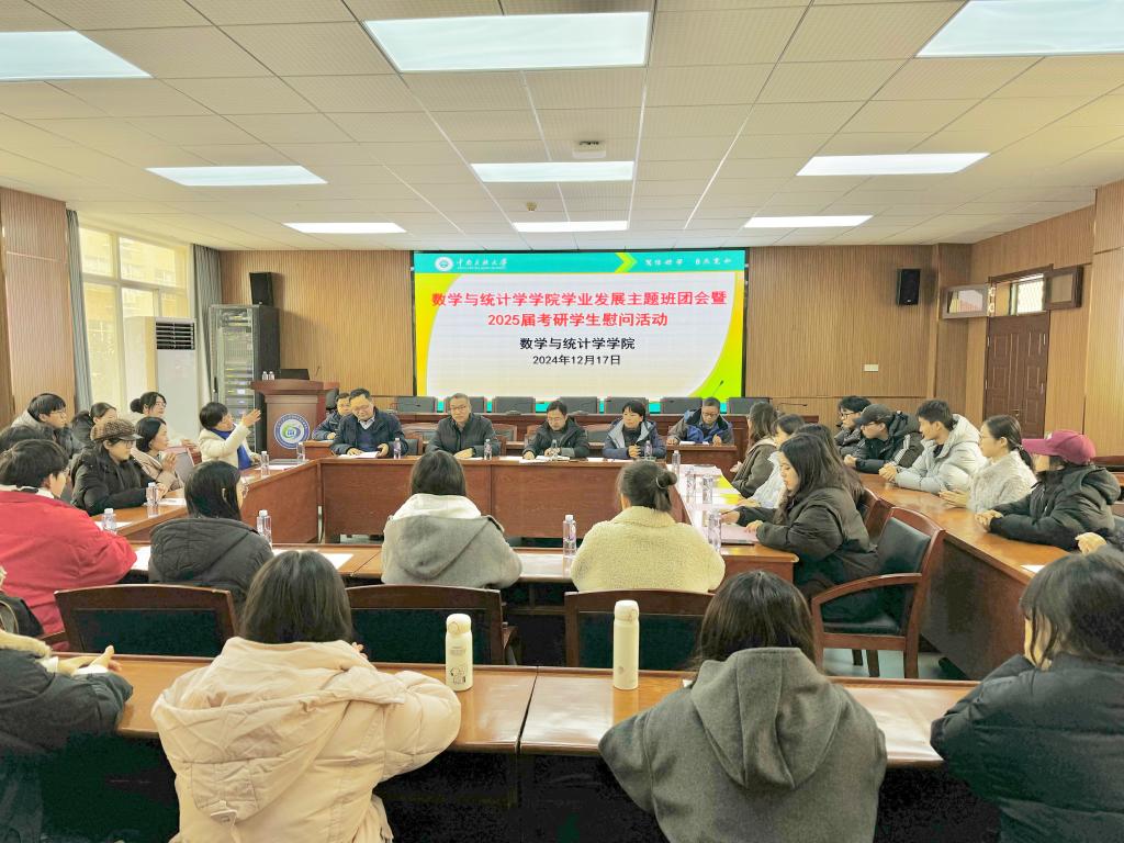 12月17日,校黨委副書記、副校長宋發軍到數學與統計學學院參加應用數學2202班主題班團會,并慰問2025屆考研學生。數學與統計學學院黨委書記郭暉,院長胡軍浩等班子成員,班導師、輔導員代表,應用數學2202班全體同學、2025屆部分保研、就業、考研學生代表參加。班團會由學院黨委副書記宋榮主持。