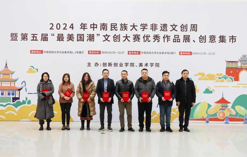 12月20日上午,學(xué)校2024年非遺文創(chuàng)周暨第五屆“最美國潮”文創(chuàng)大賽優(yōu)秀作品展、創(chuàng)意集市在我校光谷美術(shù)館舉行。校黨委副書記、副校長三朗扎西,黨委宣傳部、校團(tuán)委、創(chuàng)新創(chuàng)業(yè)學(xué)院、文學(xué)與新聞傳播學(xué)院、化學(xué)與材料科學(xué)學(xué)院、美術(shù)學(xué)院等單位負(fù)責(zé)人、師生代表參加。開幕式由美術(shù)學(xué)院副院長潘俊主持。