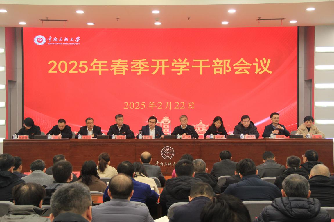 校黨委副書記、校長劉義總結了學校2025年寒假期間主要工作,就2025年工作作了重要部署。總體工作思路是:堅持以習近平新時代中國特色社會主義思想為指導,深入學習貫徹黨的二十大和二十屆二中、三中全會精神,深入貫徹落實全國教育大會精神、全國民族團結進步表彰大會精神,聚焦鑄牢中華民族共同體意識主線,全面貫徹落實潘岳同志調研學校講話精神,錨定“雙一流”建設目標,統籌推進“十四五”收官與“十五五”發展銜接,緊緊圍繞落實立德樹人根本任務,加快推進學校轉型升級和內涵式高質量發展,持續提高服務黨的民族工作和湖北支點建設的能力水平。重點工作有五個方面:一是堅持學習貫徹習近平新時代中國特色社會主義思想,強化事業發展政治引領與保障;二是堅持聚焦鑄牢中華民族共同體意識主線,持續推動學科轉型升級;三是堅持落實立德樹人根本任務,持續提升育人質量;四是堅持夯實高水平發展基礎,持續擴大學校影響力;五是堅持推進內部治理體系和治理能力現代化,持續鞏固發展支撐。