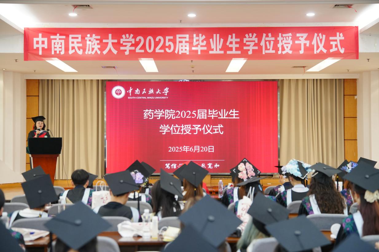 在藥學院2025屆畢業(yè)生學位授予儀式上,教師代表正在發(fā)言。藥學院供圖