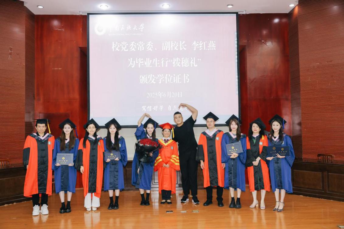 在音樂舞蹈學院2025屆畢業(yè)生學位授予儀式上,校黨委常委、副校長李紅燕與畢業(yè)生合影。音舞學院供圖