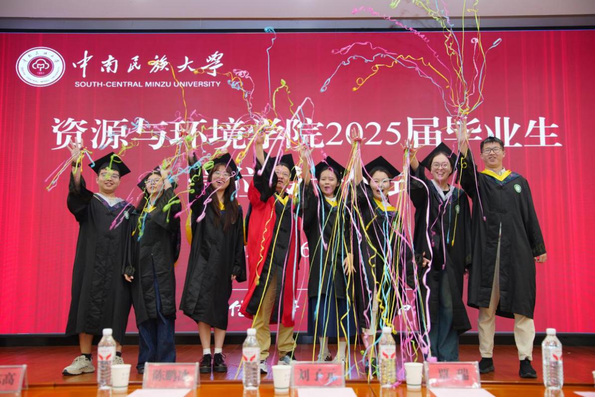 在資源與環(huán)境學院2025屆畢業(yè)生學位授予儀式上,教師與畢業(yè)生一起飛舞彩帶,畢業(yè)快樂。資環(huán)學院供圖
