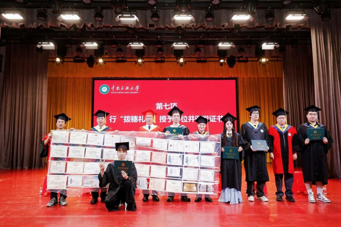 在電子信息工程學院(機器人學院)學位授予儀式上,畢業(yè)生展出自己大學4年所獲得的榮譽證書。校黨委副書記、副校長宋發(fā)軍接過“榮譽墻”,與畢業(yè)生合影記錄學生的高光時刻。電信學院供圖