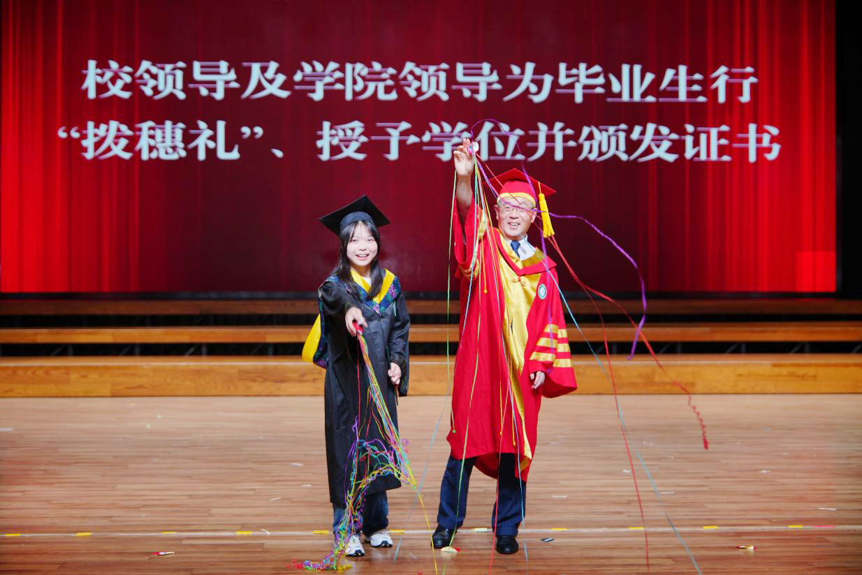 校黨委副書記、副校長宋發(fā)軍正在為計算機學院(人工智能學院)畢業(yè)生行“撥穗禮”。計算機學院供圖