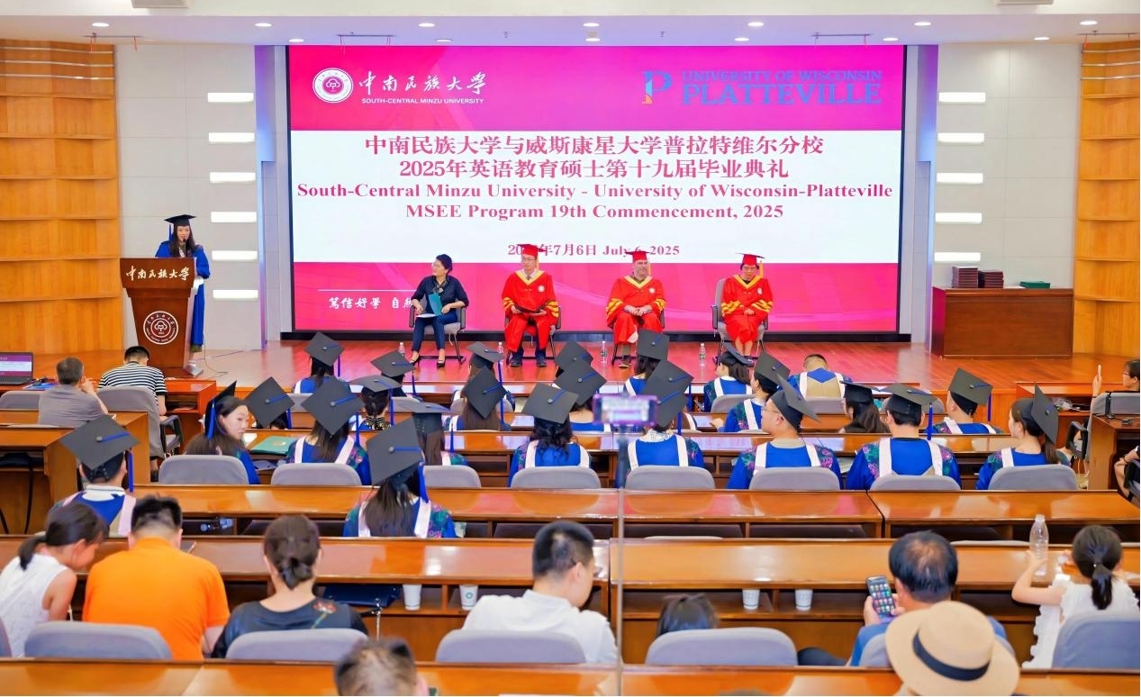 7月6日上午,學校與威斯康星大學普拉特維爾分校合作舉辦的英語教育碩士項目第十九屆學生畢業典禮暨學位授予儀式在學術交流中心舉行。校黨委常委、副校長方德斌,威斯康星大學普拉特維爾分校副教務長David Gillota、項目協調員Yuanyuan Hu教授,國際合作與交流處相關負責人參加畢業典禮。