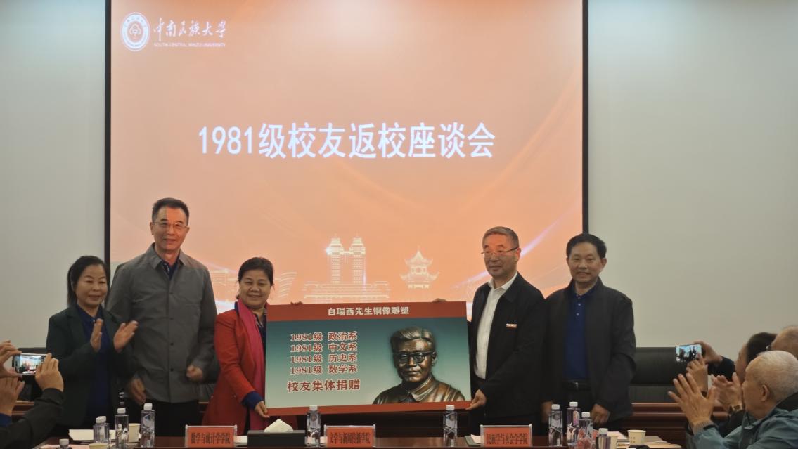 會上還舉行了捐贈儀式,1981級全體校友向母校捐贈中南民族學院原院長白瑞西先生雕像。劉義代表學校接受了捐贈。此外,1981級校友還捐贈了自己保存的當時的助學金發放名冊等資料。