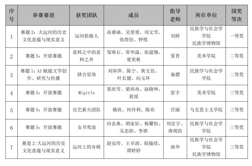 為備戰此次大賽,學校成立了由研究生院作為賽事統籌,管理學院耿新教授為賽事顧問,美術學院夏晉教授為賽事負責人,入選團隊指導老師為賽事技術指導的多層次、多維度、立體化備賽保障團隊,精心打磨參賽作品。在總決賽現場路演、答辯等多環節評比中,我校3支團隊均展現出高度的專業素養以及敏銳的思維能力。最終,民族學與社會學學院劉婷老師指導的“運河拾脈人”團隊榮獲賽事全國總決賽一等獎。由美術學院夏晉老師指導的“意料之中的意料之外”團隊,以及民族學與社會學學院秦熠老師指導的“驛合星絡”團隊分獲二等獎。