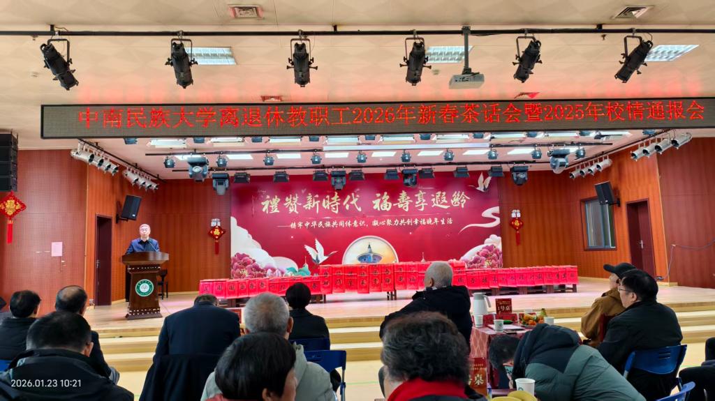 1月23日上午,學校舉行離退休教職工2026年新春茶話會暨2025年校情通報會。校黨委副書記、校長劉義,校黨委副書記、副校長宋發軍,學校離休老同志代表、退休老領導代表、校關工委與“五老”代表、老年協會及老年大學社團負責人代表,以及離退休工作領導小組成員單位、民大社區負責人和離退休工作處全體工作人員參加了此次活動。會議由宋發軍主持。
