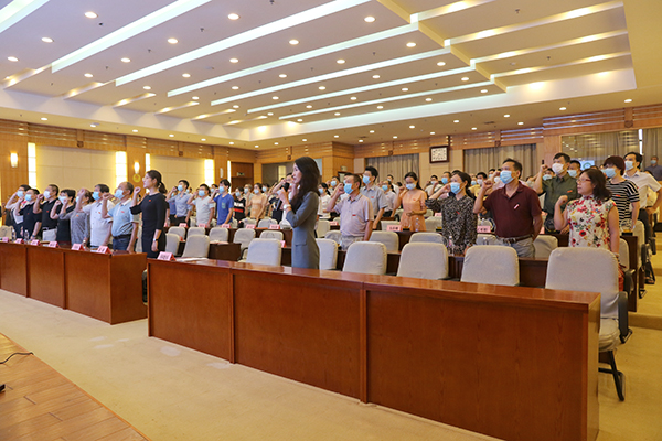 由五四青年先鋒、優秀女教工、全國十佳科普使者、化材學院韓曉樂老師領誓,全體新進教職工和與會人員莊嚴宣誓,表達了忠誠黨的教育事業的決心與信心。會上,新進教師代表還提交了廉潔從教承諾書。