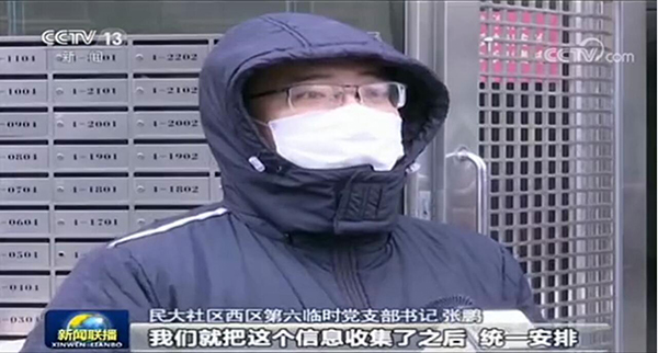 民大社區西區第六臨時黨支部書記、我校人事處副處長張鵬在接受采訪時介紹了學校黨員干部下沉社區開展疫情防控、服務社區居民的工作情況,“我們就把信息收集之后,統一安排。邊摸底、邊解困、邊解難。”