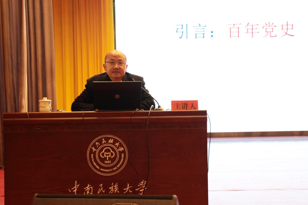 龔先慶教授主要從事中共黨史與黨的建設研究,入選湖北省中青年馬克思主義理論家培育計劃,系中國中共黨史人物研究會理事、湖北省科學社會主義學會副會長。他以《百年大黨的偉大光榮》為題,從百年黨史中的3個《決議》談起,從黨百年奮斗的重大成就、黨百年奮斗的歷史意義與歷史經驗、黨的十九屆六中全會精神的落實要求3方面展開宣講。報告深刻解讀了黨的十九屆六中全會精神,介紹了黨在四個歷史時期取得的四個重大成就和四個偉大飛躍;介紹了我們黨的百年奮斗具有的五個方面的重大歷史意義,積累的十個方面的寶貴歷史經驗。龔教授指出,要牢記中國共產黨是什么、要干什么這個根本問題,積極響應黨中央的號召,更加緊密地團結在以習近平同志為核心的黨中央周圍,為實現第二個百年奮斗目標、實現中華民族偉大復興的中國夢而不懈奮斗。