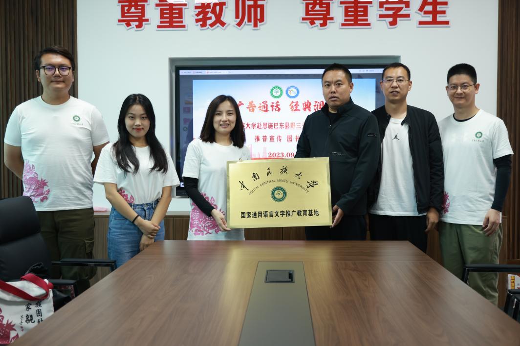 在推普活動中,我校師生一行與兩所小學師生開展了座談,就加強民族地區鄉村小學國家通用語言文字推廣工作進行了交流。座談會上,我校向兩所學校授予了“中南民族大學國家通用語言文字推廣教育基地”牌匾。雙方就加強基地建設、推普助力鄉村振興等展開了探討,取得了良好效果。