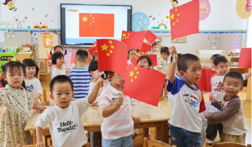 “老師,慶祝祖國媽媽生日,我們也想送禮物!”一聲聲稚嫩又親昵的話語傳遞著小朋友們內心深處的愛國情懷。各班老師也正是觀察到孩子們的愿望,準備了不同形式的愛國主題課程。課堂上,不論是考驗耐性的積木建構課,還是比拼靈巧的手工制作課,小朋友們都專心致志,用自己的頭腦去創新創意,把對祖國母親的祝福和愛意流入作品當中。老師們以“云觀摩”為切入點,引領小朋友們參觀天安門,了解五星紅旗誕生背后的故事,組織“闖關摘國旗”等小游戲,激發孩子們勇奪第一、向旗幟看齊的成長意識,實現高質效的“以情施教,依情助教”。