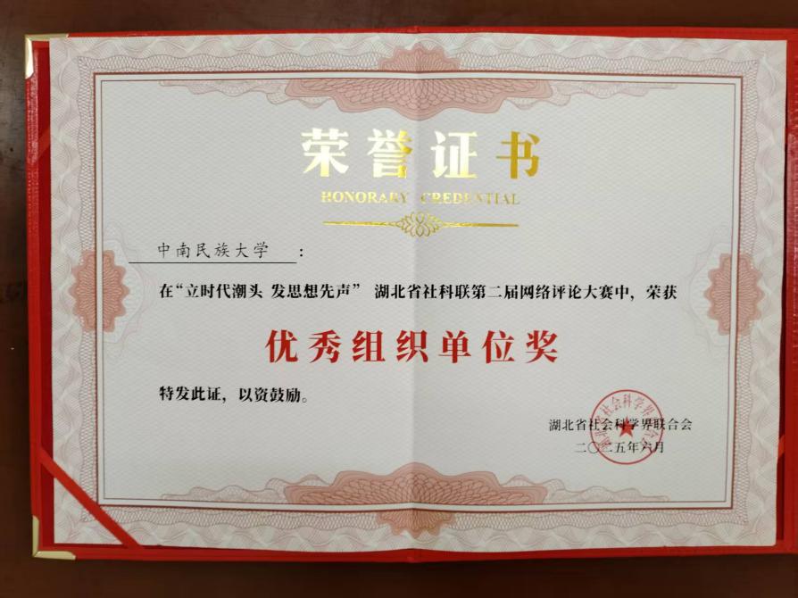 6月26日,由湖北省社會科學界聯合會(以下簡稱“湖北省社科聯”)主辦,湖北省社科信息中心、荊楚網(湖北日報網)、楚天網絡評論研究院承辦的“立時代潮頭 發思想先聲”湖北省社科聯第二屆網評大賽頒獎儀式在楚天傳媒大廈舉行,我校喜獲1個一等獎、1個優秀作品獎,并榮獲優秀組織單位獎。