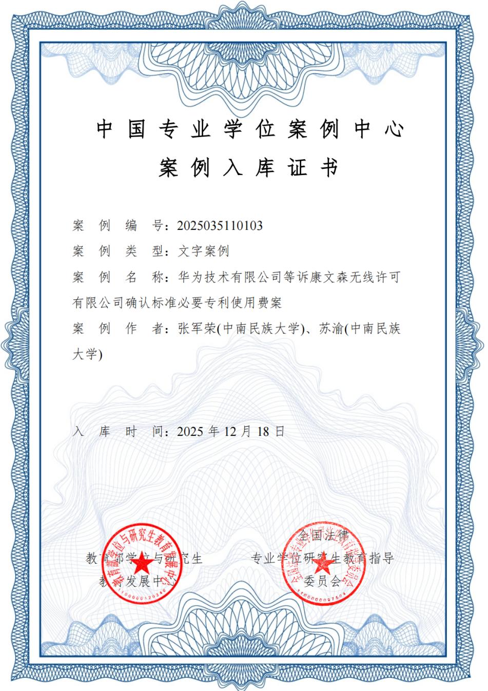 12月18日,全國法律專業(yè)學位研究生教育指導委員會公布第五批法律碩士專業(yè)學位文字教學案例入庫名單。我校法學院張軍榮副教授、2024級民商法學碩士研究生蘇渝共同撰寫的《華為技術(shù)有限公司等訴康文森無線許可有限公司確認標準必要專利使用費案》教學案例,經(jīng)專家評審并報全國法律專業(yè)學位研究生教育指導委員會審議,成功入選中國專業(yè)學位案例中心案例庫。
