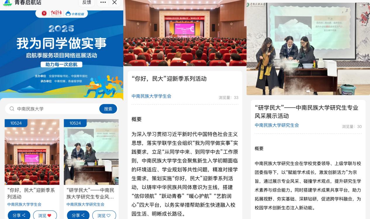 1月上旬,由全國學聯秘書處與中國青年報、中青校媒聯合發起的全國高校學生會組織“我為同學做實事”啟航季服務項目網絡巡展名單揭曉。我校學生會、研究生會申報的“‘你好民大’迎新季系列活動”與“‘研學民大’——中南民族大學研究生專業風采展示活動”成功入選全國巡展名單。