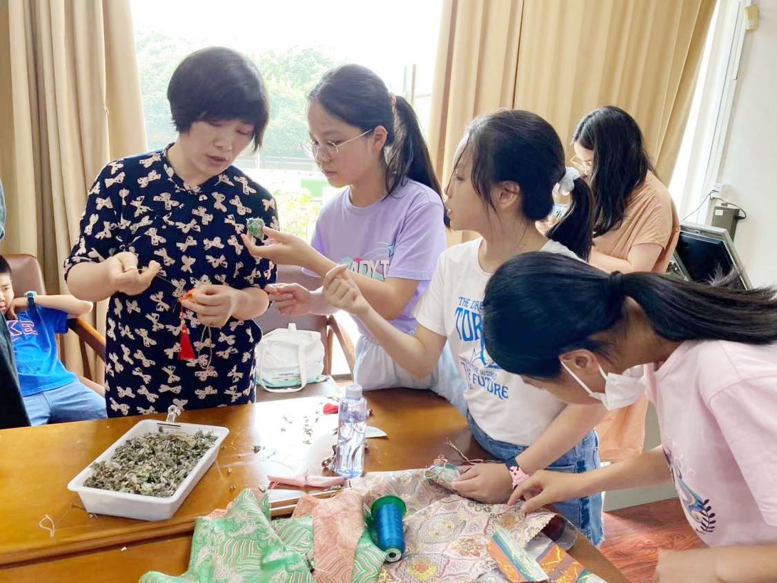 小朋友們裁剪布料,制作精美香囊。 龔唯 攝