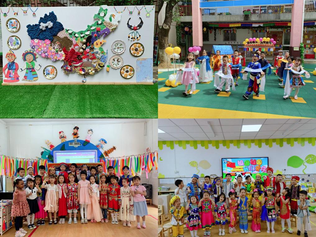 小四班小朋友們充分發(fā)揮想象力,在透明雨傘上繪制各種花紋及卡通圖案,并通過《彩云之南》、傣族象腳鼓的舞蹈表演、民族服裝表演秀、背簍投糠包游戲展示祖國的遼闊;中二班小朋友們身穿民族盛裝,通過《小格桑》《北京的金山上》《最炫民族風》《祖國祖國我愛你》等歌曲演唱、熱情洋溢的熱巴舞蹈、活力四射的打毛蛋游戲以及充滿地域特色的繪畫、手工作品展示,表達對祖國的熱愛和民族團結一家親的感情;大二班的小朋友將中華傳統(tǒng)文化融入“華裳秀典:親子自制服裝秀”“錦繡中華——藏文化作品展”“塑其姓”“才藝匯演”等特色活動,通過繪畫、手工的形式制作中國地圖、用超輕黏土捏出姓氏并上色裝飾,展示傳統(tǒng)書法的韻味。