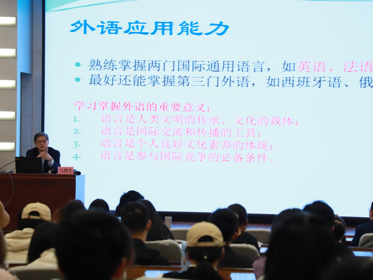 馬燕生首先介紹了當今社會對國際化人才的需求,以及我國國際化人才存在的問題和不足。他認為,目前我國缺乏具有國際視野、世界胸懷以及過硬的專業能力和外語水平的高層次國際化人才。他勉勵同學們培養“中國情懷、國際視野、世界胸懷”,力爭成為專業復合、語言復合的“雙復合”型國際化人才。他強調,同學們要不斷提高自身政治素質、專業素質、知識素養、個人素養,以及外語應用能力、交流溝通能力、統籌協調能力、分析研判能力,以滿足當今社會對高層次國際化人才的需求。