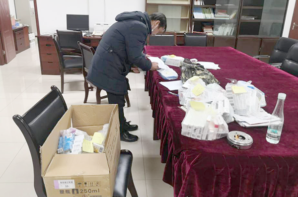 劉東對采購的藥品進行分類。離退休工作處供圖