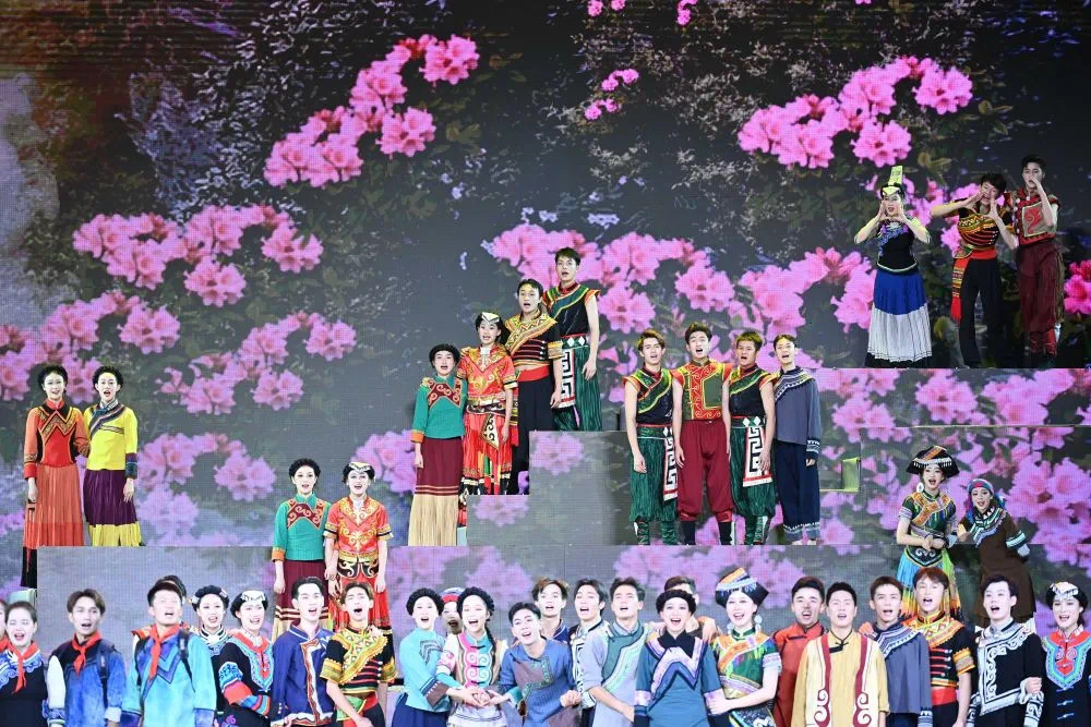 中華民族一家親,同心共筑中國夢。一曲絢麗多姿的歌舞表演《各族兒女心向黨》拉開了開幕式文藝晚會《團結奮進新征程》的帷幕。整臺晚會由“同心筑中華”感恩新時代“奮進新征程”3個篇章組成,音詩畫《血脈相連》、歌舞《壯美漓江》、非遺集錦《璀璨明珠耀中華》、情景歌舞《村寨里的云生活》等節目精彩上演,熱情謳歌了各族兒女在黨的領導下和睦相處、和衷共濟、和諧發展的幸福生活,充分表達了他們對偉大祖國的深深熱愛。我校2018、2019、2020級舞蹈表演和舞蹈學專業的80名學生,在李鳴曦、鐘楨兩位帶隊老師指導下,以高度的專業素養和滿腔的熱情參演了情景歌舞《村寨里的云生活》和《漫山花兒在等待》,贏得了觀眾陣陣熱烈的掌聲。此外,我校饒嬈老師還應邀參加了晚會的編導工作。