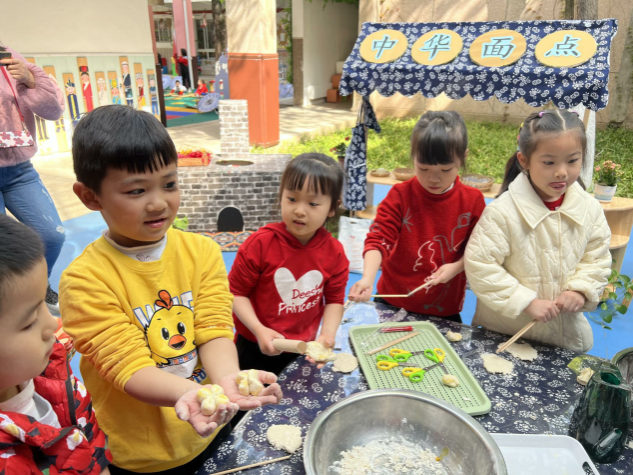 “我想給小丸子做個蝴蝶結”“我想做個大熊貓”“我幫你把東西送到那邊的灶臺蒸熟”“那我們就去那兒吃點心,品品茶吧?”……孩子們自由開心地表達著自己的想法。