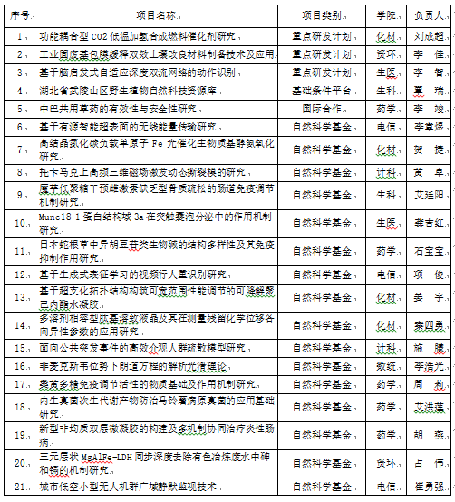 近段時間以來,湖北省科技廳陸續公布了2022年度湖北省科技計劃項目立項名單。截至11月28日,我校共獲批項目21項,經費達405萬元。項目覆蓋重點研發計劃、基礎條件平臺、國際合作、省自然科學基金等多個類別,涉及高新技術、社會發展、基礎研究等多個研究領域。