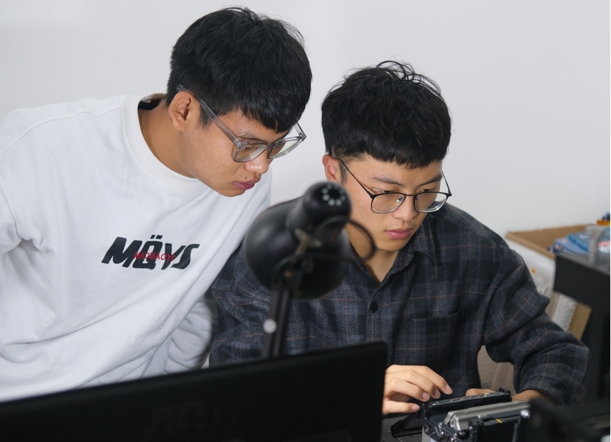 冉思向(右)與同學趙忠科合作開展特種光纖熔接實驗。 電信學院供圖