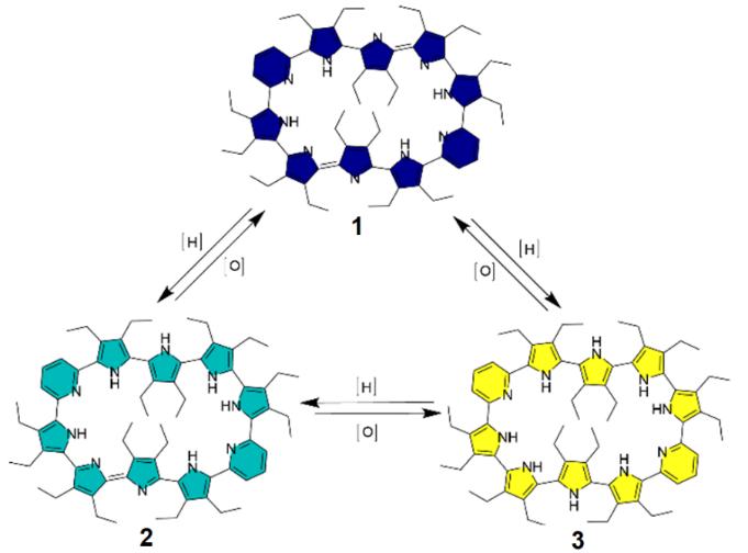 自然界的多數元素都具有不同的氧化狀態,它們的氧化態與其化學性質、物理性質、及在生物體內的生理活性息息相關。具有較大共軛體系的有機大環化合物也可以存在不同的氧化態,盡管這類化合物在分子識別方面有著天然優勢,但是具有多重閉殼氧化態的大環化合物仍非常罕見。為了開拓大環化合物在分子識別中的應用,張展教授課題組設計合成了一個具有三重閉殼氧化態的擴展卟啉化合物——環[2]吡啶[8]吡咯。該大環化合物可以以三種氧化態存在,遇到硫醇會被還原呈現出不同顏色,從而可以區分識別具有生理活性的生物硫醇,即半胱氨酸、同型半胱氨酸、及谷胱甘肽。