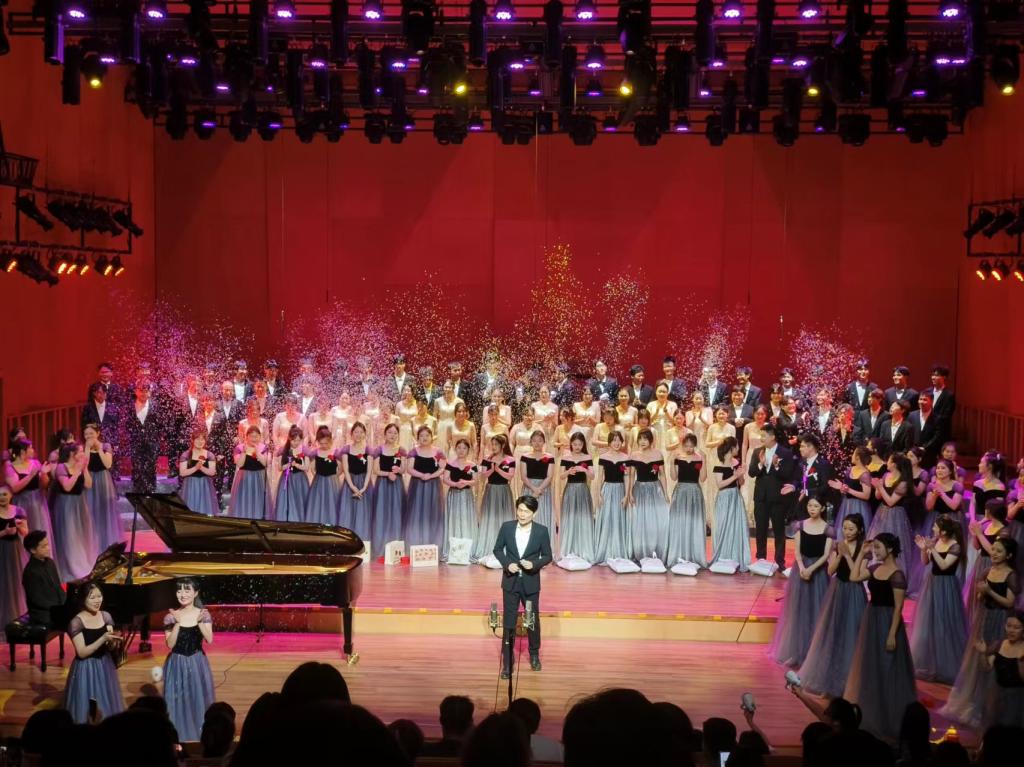 此次音樂會將合唱與美育目標進一步融合,將中小學教材內容貫穿其中,《讓世界充滿愛》《讓我們蕩起雙槳》《歌聲與微笑》等曲目在展現美育實踐成果的同時,也將觀眾帶回到兒時的童真歲月,與“我們的歌”主題所要體現的“在光影中觀察四季,在歌聲中記錄流年”相契合。除此之外,此次音樂會還包含了許多別具一格的民族特色曲目?!赌嵘健啡谌肓嗣晒抛骞爬铣ā昂酐湣迸c特色樂器馬頭琴,在合唱團悠長的歌聲中,帶領現場觀眾感受遼遠開闊的大草原之境?!度隼飭啡诤狭嗽颇细髅褡宓那徽{和語言,躍動的旋律奔放而歡快,展現出美好家園的千姿百態。
