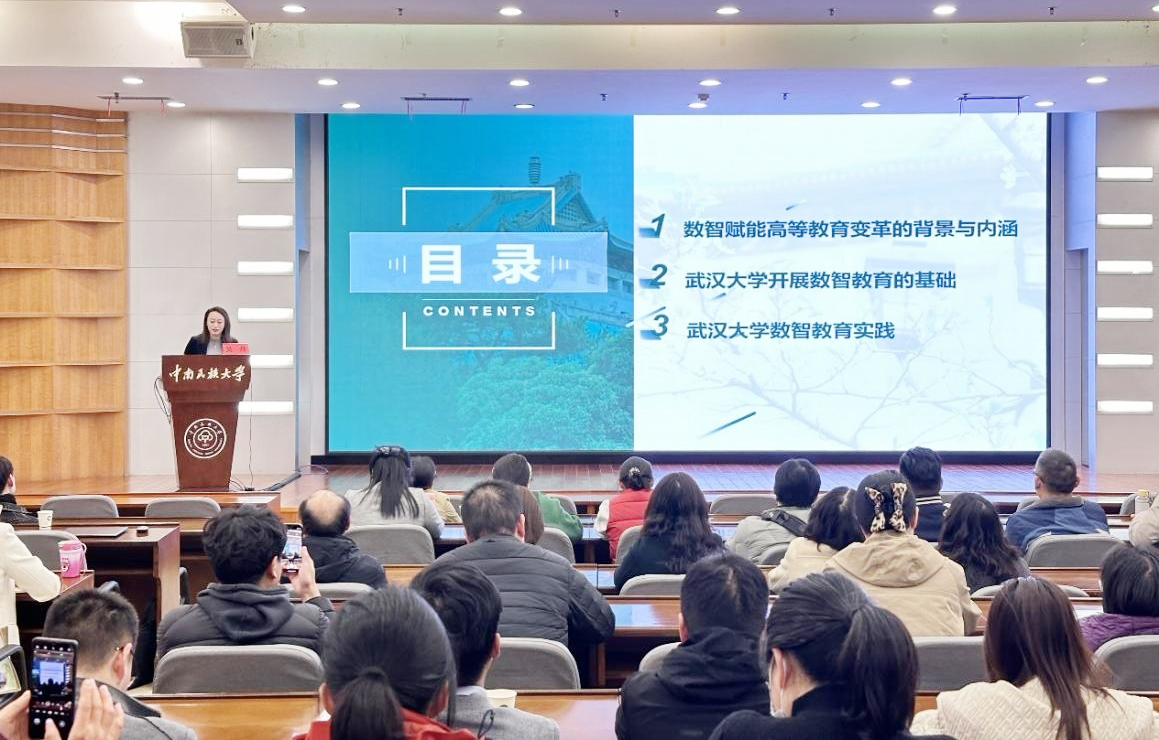 為推動數智教育教學改革創新,探索人工智能技術賦能教育教學的新思路和新舉措,3月19日,黨委教師工作部(教師教學發展中心)、教務處、信息化建設管理處(現代教育技術中心)聯合開展人工智能賦能教育教學改革系列培訓第一講。國家重大人才工程計劃特聘教授、武漢大學本科生院院長吳丹教授應邀作題為《數智教育助推高校拔尖創新人才培養——武漢大學數智教育改革》的專題報告。各學院教學副院長、專業負責人、專任教師代表、教學管理人員代表等160余人參加了本次培訓。