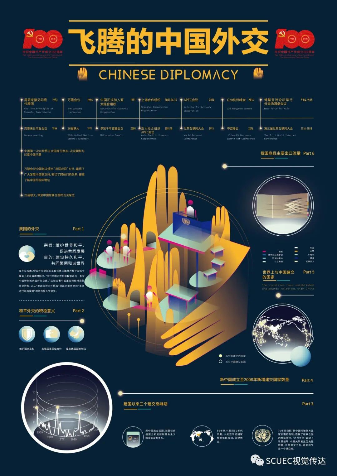 本次課程展示主要分動畫、海報主圖及文創(chuàng)產(chǎn)品設(shè)計3個部分。同學(xué)們對國家經(jīng)濟發(fā)展、科技變遷、人民生活條件改善等方面進行圖文收集與分析,以圖文圖形化、數(shù)據(jù)圖表化等靜態(tài)轉(zhuǎn)動態(tài)、抽象變具象的創(chuàng)新型視覺表現(xiàn)方式展現(xiàn)我國發(fā)展變化與發(fā)展成果,改變了以往單一的靜態(tài)平面展示,并將相關(guān)民族、文化、思政元素融入動態(tài)海報及文創(chuàng)產(chǎn)品當(dāng)中。例如《建黨100周年以來的媒體變遷》、《飛騰的中國外交》、《能源發(fā)展圖鑒》、《中國航天檔案》、《中國高鐵》和《建校70周年之絲巾地圖文創(chuàng)設(shè)計》等作品既有宏闊主題,也有實用設(shè)計,均精美生動,可圈可點。
